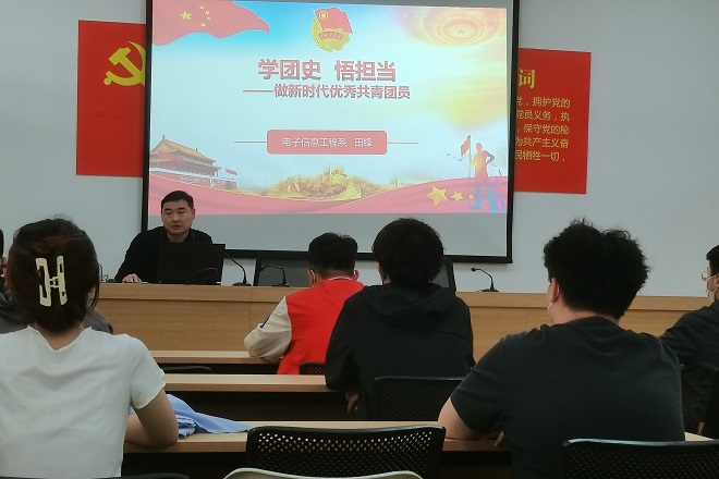 5月3日,首期微团课“学团史,悟担当——做新时代优秀共青团员”在地滋楼A421开讲,电子信息工程系党总支副书记田锋主讲,学生会干部、团支书参加。