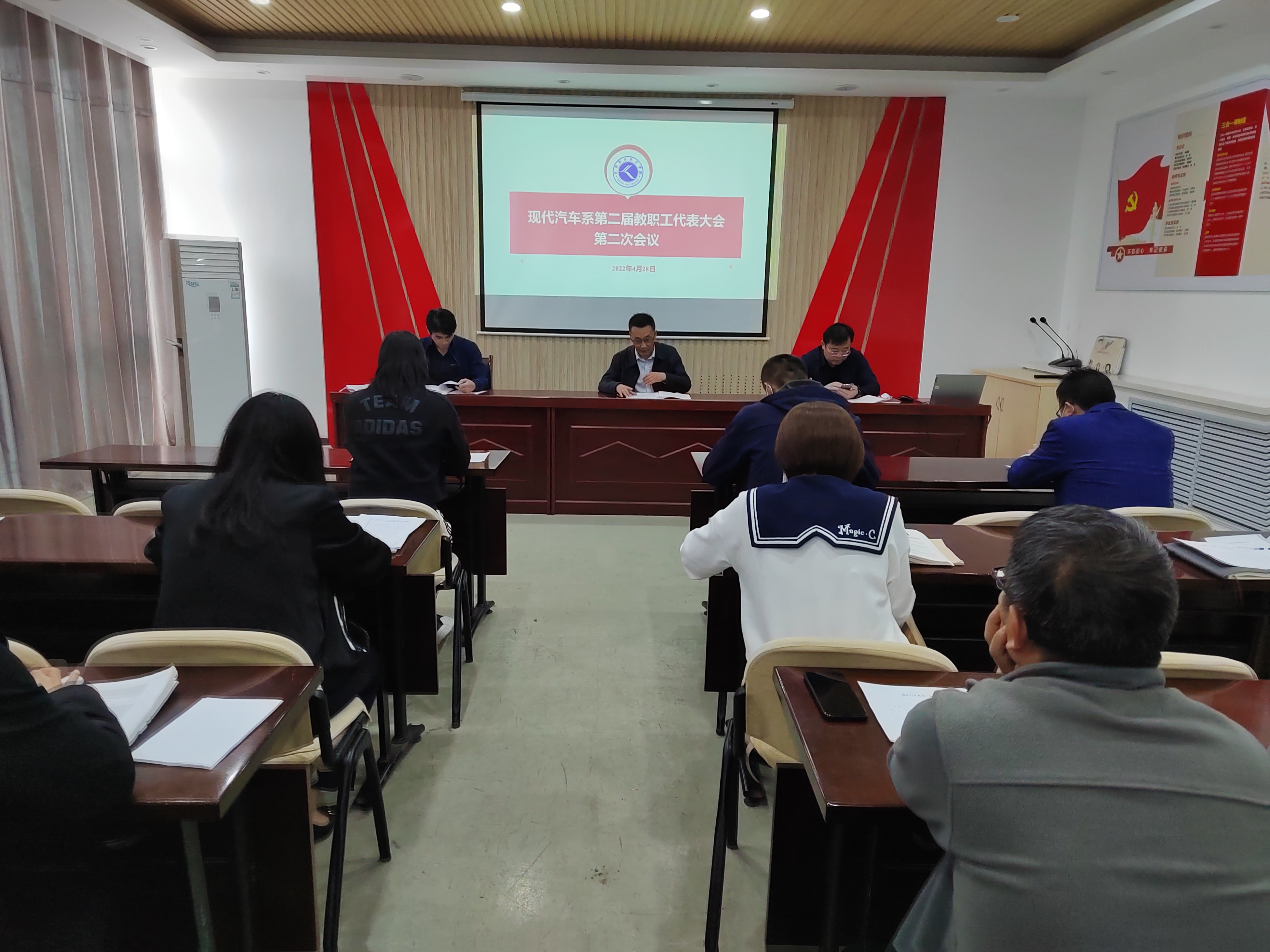 4月28日下午,现代汽车系第二届教职工代表大会第二次会议在山润楼二楼会议室顺利召开。党总支副书记庄岩主持大会,45名教师代表参加会议。