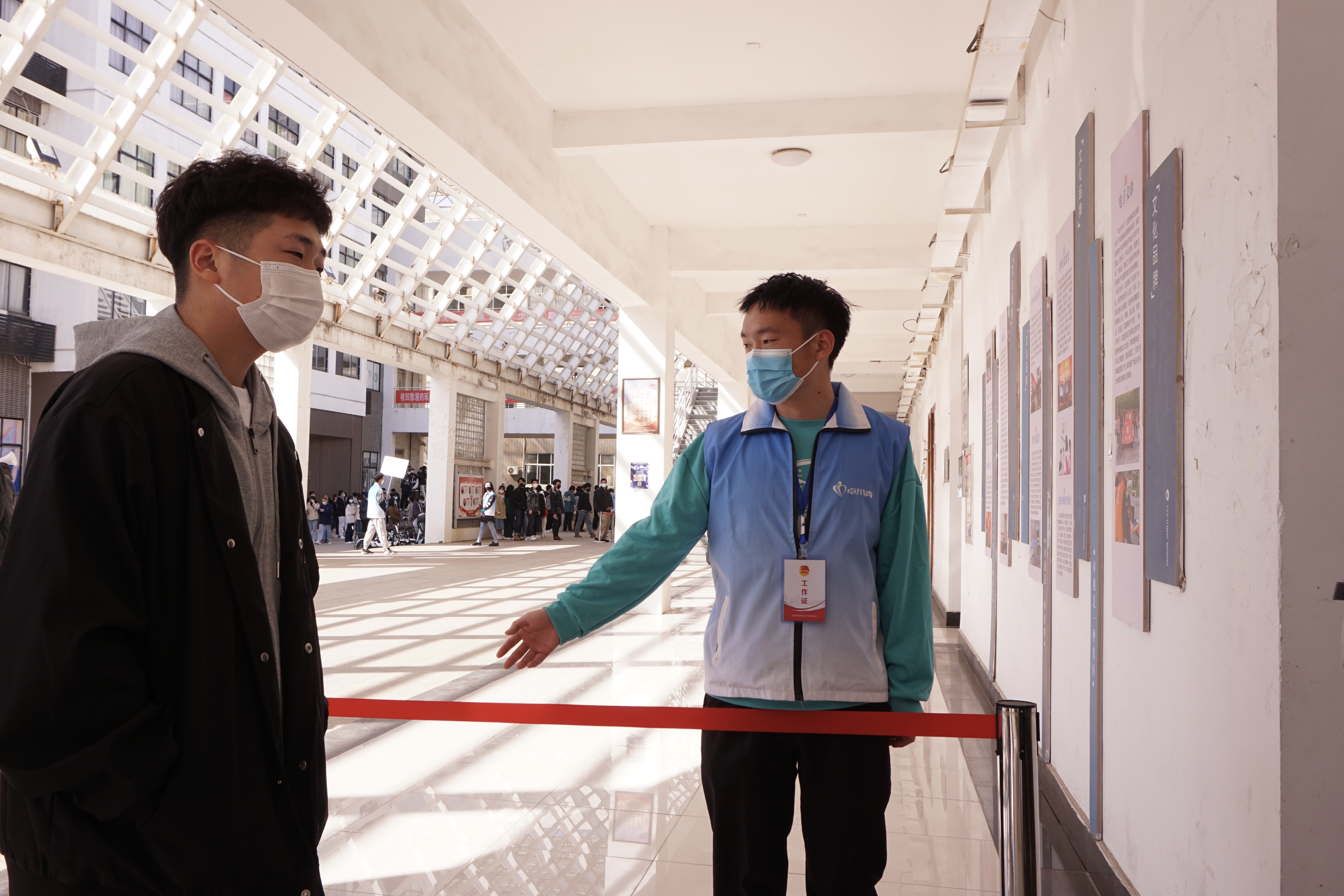 当被问及为什么来做志愿服务时,同在做志愿服务的2020级飞行器制造技术专业学生林祥政和2020级数控技术专业学生李国异口同声地说:“作为青年志愿者协会的成员。通过志愿服务这个‘沉浸式’的第二课堂,我们接触了责任、感受了担当、领悟了协同、厚植了家国情怀。一听到疫情防控需要志愿志愿者,我们就马上报名来了。”