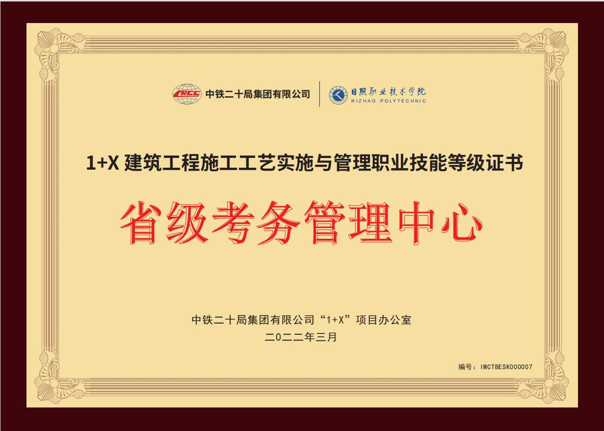 2021年学校成功申请成为建筑工程施工工艺实施与管理职业技能等级证书考核站点并组织学生进行考试,2022年3月学校被中铁二十局集团有限公司1+X项目办公室确定为建筑工程施工工艺实施与管理职业技能等级证书省级考务管理中心和2021年度优秀教学奖。