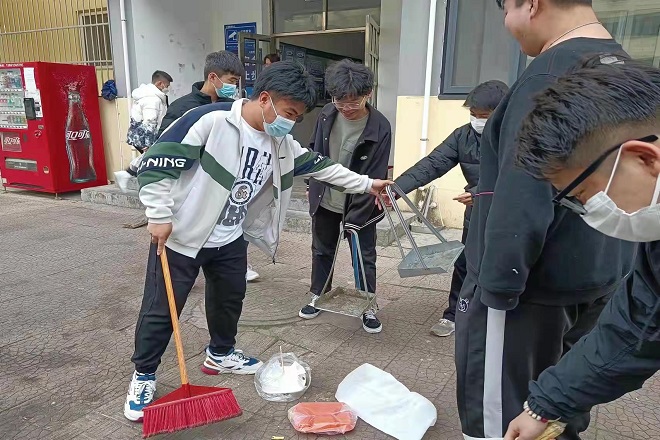 活动前,所有人员进行体温检测,经过分工后大家迅速投入到志愿活动中。志愿者们将毓华园十号楼前后的卫生死角进行了彻底清理,并对安全隐患进行了排查,同时督促各宿舍不要从阳台乱扔垃圾。由于正处疫情防控关键时期,此次活动也重点对楼道进行了消毒处理。在消毒过程中,工作人员对宿舍楼梯间、走廊等公共场所进行系统消毒,做到不留遗漏。所有同学不嫌脏不嫌累,仔细打扫,真正体会到“劳动最光荣”的荣耀感,提升了团结协作能力。