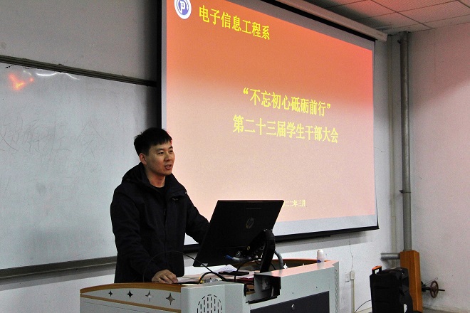 为提升我系学生干部队伍的整体素质,打造一支本领过硬,作风硬朗,高素质的学生干部队伍,切实发挥学生干部在学生群体中的引领作用。3月1日晚,电子信息工程系在地滋楼B123召开“不忘初心,砥砺前行”为主题的学生干部会议,团总支辅导员张西杨及全体学生干部参会。