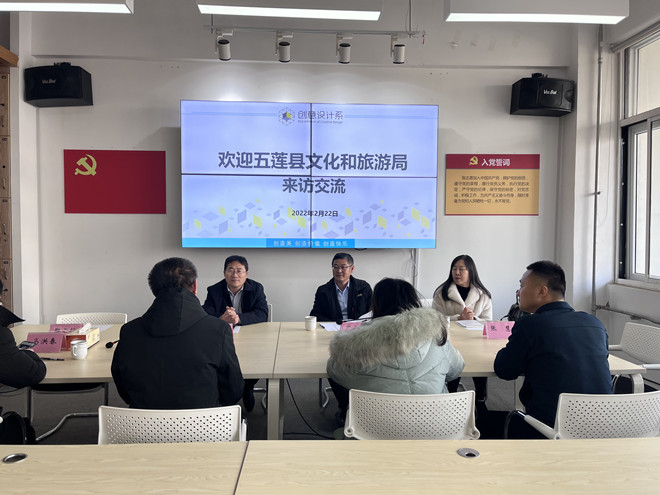 2月22日,五莲县文旅局党组成员、副局长李少华,五莲县委宣传部部务会成员周家服,五莲县文化馆党支部成员张慧一行3人来我校调研交流。创意设计系主任张永宾、视觉传达专业教研室主任杨璐莎及部分骨干教师等热情接待来宾并进行了座谈交流。