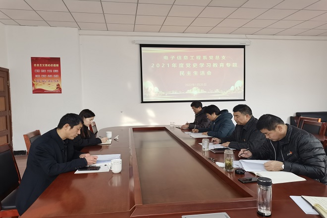 按照上级统一部署和学校党委安排,1月25日下午,电子信息工程系党总支班子在地滋楼A404会议室召开2021年度党史学习教育专题民主生活会。学校党史学习教育领导小组办公室陈晖到会督导,党总支书记马伟主持会议,党总支班子成员参加会议。
