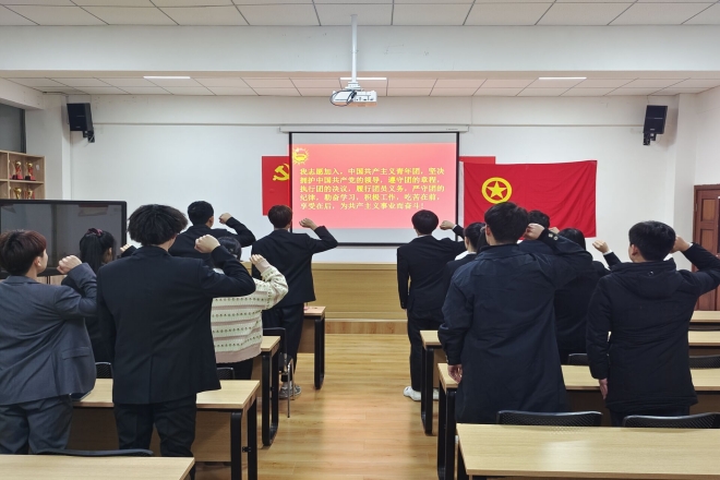 入团仪式在庄严的国歌声中拉开帷幕。主持人宣布新团员名单,并代表团总支向新团员表示热烈的祝贺。接着,由团支书为新团员佩戴团徽,希望每个新团员能够努力学习,积极向上,充分发挥团员模范带头作用,认真履行团员义务,认清自己肩负的责任,用实际行动来维护“共青团员”这个光荣的称号。最后,由学生会主席秦驰带领新团员和老团员代表面向团旗庄严宣誓。面对鲜艳的团旗,全体团员右手握拳,以最宏亮的声音进行庄严宣誓:我志愿加入中国共产主义青年团……为共产主义事业而奋斗。