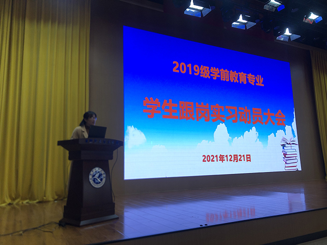 12月21日上午,人文旅游系学前教育专业2019级学生顶岗实习动员会在图书馆二楼报告厅举行。人文旅游系教学科代理科长张金芝,学前教育教研室主任成晓利,全体实习指导老师以及2019级学生参加大会。