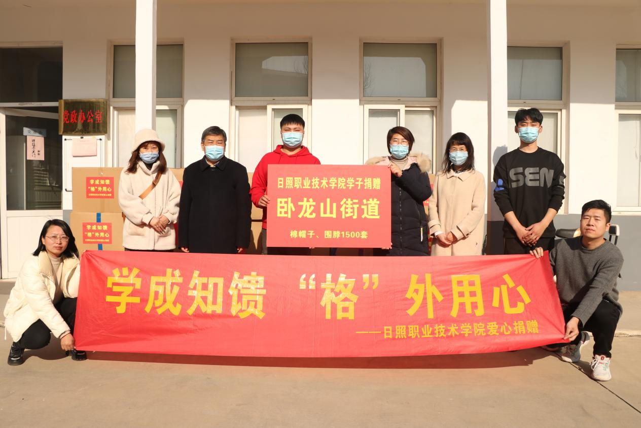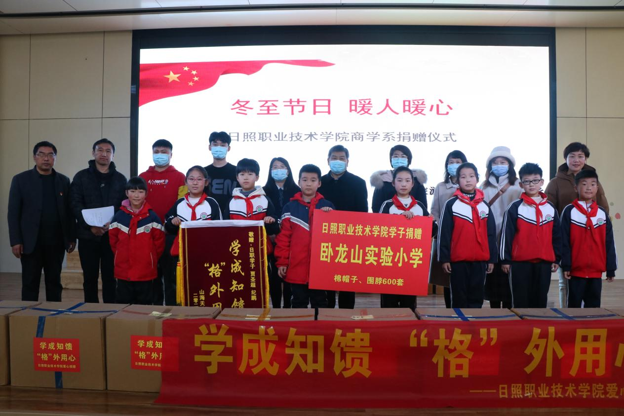 12月21日上午,第一站、第二站前往山海天实验幼儿园和卧龙山实验小学,分别捐赠棉帽、围脖660套和600套,山海天教育和体育局党组成员马先艳和卧龙山街道宣传委员申敏璇出席了活动。幼儿园小朋友载歌载舞,用稚嫩的声音表达了对他们的感谢,并回赠了小朋友们自己制作的充满童真的礼物。实验小学的同学们敬献了锦旗,并表示会好好学习,报效祖国,并把爱继续传递下去。贾圣超在卧龙山实验小学接受日照市电视台采访时表示,这次捐赠目的是将爱传递给更多人,唤起同学们的爱心,将来长大也要同他们一样,学有所成,学成知馈。第三站前往卧龙山街道,向卧龙山街道贫困户老人和儿童捐赠棉帽、围脖1500套。