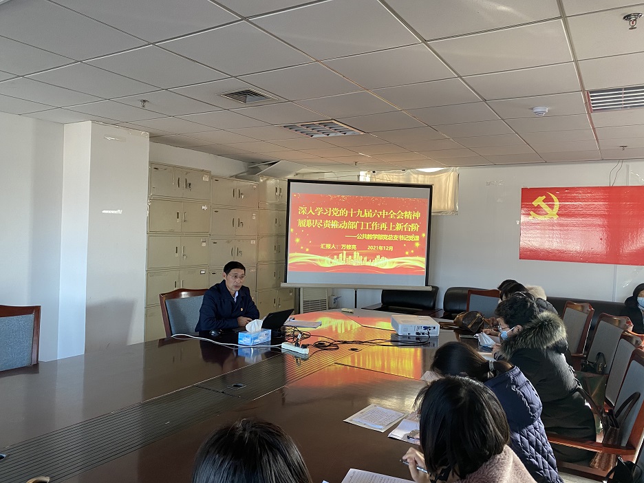 12月17日下午,公共教学部党总支书记万修亮在天润楼501会议室讲“深入学习党的十九届六中全会精神,履职尽责推动部门工作再上新台阶”专题党课。公共教学部全体党员教师参加。