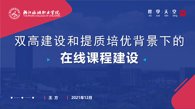 为进一步深化线上线下教学融合,促进优质教育资源应用与共享,切实提升教师在线开放课程建设质量,12月14日,人文与旅游系邀请浙江旅游职业学院副校长王方作题为“双高建设和提质培优背景下的在线课程建设”的精彩线上报告。线上培训由高教研究中心副主任、“双高校”建设办公室副主任张继光主持,人文与旅游系、商学系和创意设计系等教师聆听了报告。