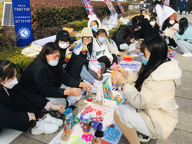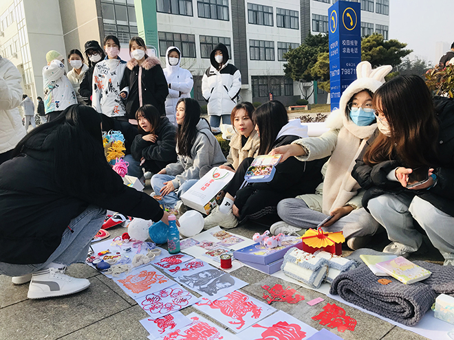 12月15日、17日,学前教育专业的200多名学生在卓越广场和新食堂门口举办了两场民俗工艺小集市活动,展示了他们的民俗手工作品。小集市上,近30个摊位紧密相连,摆满了学生自主设计制作的京剧人物造型、编织小筐、手工小包、剪纸、镶金对联、手工挂饰、DIY头饰、皮影人物、手工花艺、精美手绘书签等纯手工艺术作品。这些作品是学生本学期学习《幼儿园环境创设与玩教具制作》这门课程中“民俗工艺在幼儿园的应用”部分时,将知识融会贯通、举一反三进行的艺术再创作。集市售卖现场非常火爆,吸引了全校师生前来“淘宝赶集”。当问到学生们的收获时,他们脸上洋溢着满满的自信和喜悦。“老师,我们这个摊位,今天已经卖了200多元了”、“当自己的作品得到称赞时,心里感到特别高兴”......