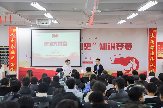12月8日,由团委主办,现代汽车系承办的厚德大讲堂在山润楼219报告厅举行。2010届汽车检测与维修技术专业校友王哲受邀担任主讲嘉宾,系团总支全体辅导员和200余名学生代表参加活动。