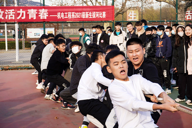 为丰富学生们的课余文化生活,激发同学们参与体育锻炼的积极性,进一步培养学生团队合作与拼搏精神,12月7日,机电工程系在学校篮球场组织2021级新生开展了以“礼赞建党百年,绽放活力青春”为主题的拔河比赛。来自2021级的20支代表队共计300余人参加了比赛。