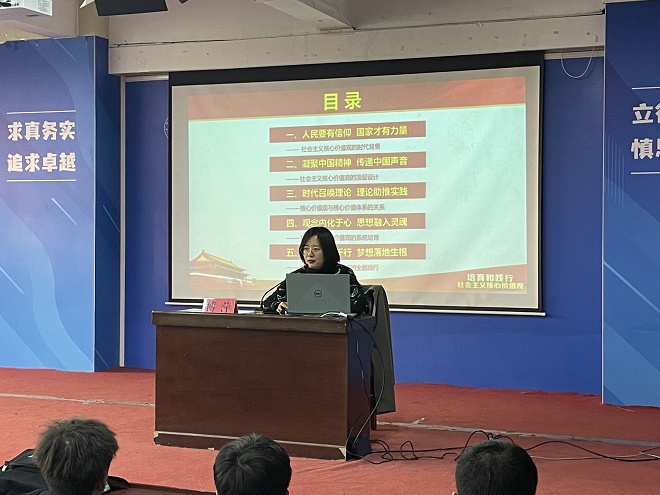 傅萍首先介绍了社会主义核心价值体系,体系是由马克思主义指导思想、中国特色社会主义共同理想、以爱国主义为核心的民族精神和以改革创新为核心的时代精神、社会主义荣辱观四个方面内容构成。社会主义核心价值观要求把国家、社会、公民三个层面的价值融为一体,是社会主义核心价值体系的内核凝练和集中表达,是当代中国精神的集中体现,凝结着全体人民共同的价值追求。她还详细讲解了陶行知先生教育救国的思想,在社会主义核心价值观中体现为爱国敬业,作为新时代青年应当学习这种爱国精神,把社会主义核心价值观融入到学习和生活的各个方面。最后,她呼吁大家作为一名入党积极分子,更要积极践行社会主义核心价值观,要做到“勤学、修德、明辨、朴实”,做好学生的本职工作,多读书,勤读书。