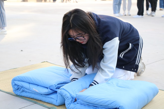 叠军被作为宿舍内务评比的一个大指标,是宿舍文化节活动的重要组成部分。随着比赛的开始,各班级参赛的同学们立刻进入比赛状态,平铺、横拆、画线、竖折、修边、扯角各个动作有条不紊,娴熟的手法,毫不慌乱的步骤,无不透露出他们私下里经过无数次的练习。几分钟后,选手们将自己的“豆腐块”展现给大家。本次比赛本着“公开、公平、公正”原则,现场评比,争取民主意见,评选出最优秀的作品。