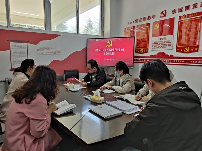11月18日下午,建筑工程系学生党支部在海润楼M101召开十一月份第二次主题党日活动,全体党员参加会议。会议由学生党支部组织委员毛风华主持。
