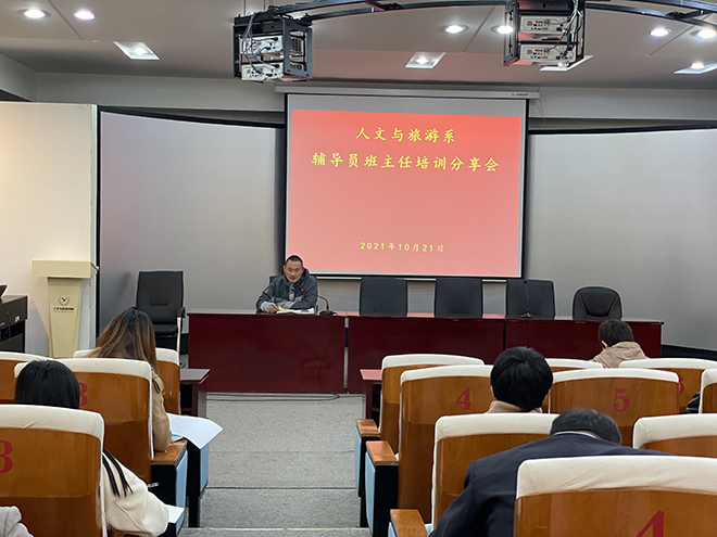 为了进一步加强班主任队伍建设,提高班主任管理水平,10月21日下午,人文与旅游系在和润楼一楼会议室召开班主任培训分享会。会议由系党总支副书记陈玉香主持,全体辅导员和班主任参加。
