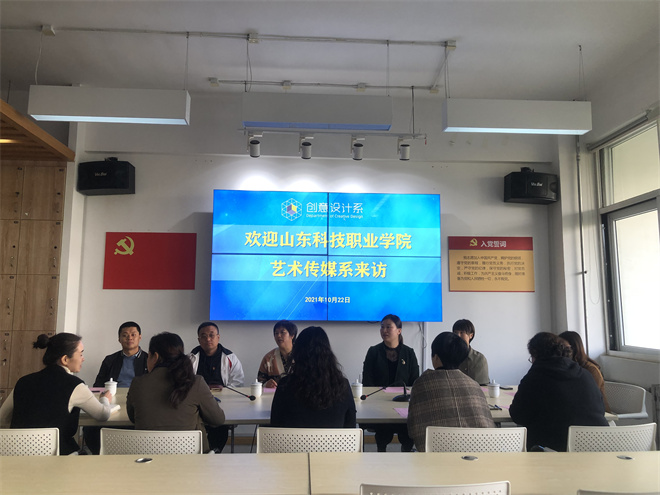 10月22日,山东科技职业学院艺术传媒系主任李爱香一行6人来我校创意设计系考察交流,系副主任李德华接待了来访客人,并带领客人参观了文化创意中心、实训室及党员活动室等场所。创意设计系党总支副书记张云丽及部分领导班子成员、教研室主任参加了座谈交流活动。
