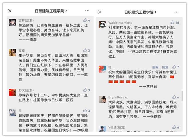在新中国成立72周年之际,为进一步激发同学们的爱国意识,培养大家深厚的社会责任感,引导他们应当坚定“常以天下为己任”的信念。建筑工程系开展网上签名寄语活动,表达对祖国母亲的深深热爱之情。