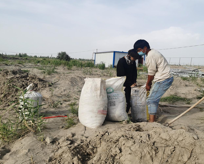 面对当地无大型建筑设备窘况,亲自上阵,与维吾尔工人兄弟一起用铁锹,锄头等初级的建设工具,进行平整池塘、铺设地膜、安装管道等等一系列工作,在过程中,展现了实践着“事业成于实干”的精神,烈日也他们皮肤上留下了“最美”劳动印记,向三位同学致敬!