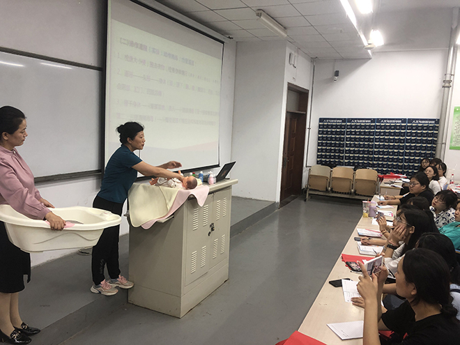 培训中教师采取理论+实践相结合的授课模式,从宝宝洗澡、脐部消毒、臀部护理、尿布疹的形成原因和护理、高热昏厥的处理、器官异物的初步处理、婴幼儿头皮血肿的急救处理、婴幼儿蜂蜇虫咬的处理等方面进行了详细地讲解和演示。培训教师讲解自然、演示规范,牢牢抓住了学生的注意力和兴趣。培训过程中,学生按照要求认真进行模仿演练,不断提升操作技能。