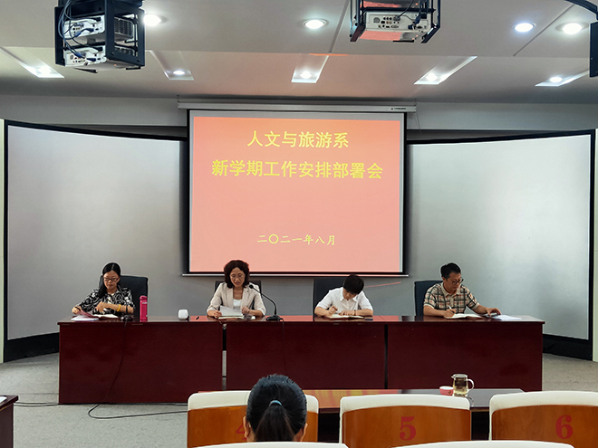为切实做好开学前各项准备工作,确保新学期学院各项工作的有序开展,8月26日上午,人文与旅游系在和润楼一楼报告厅召开了新学期工作部署会。会议由系党总支副书记陈玉香主持,学院班子成员和全体教师参加。