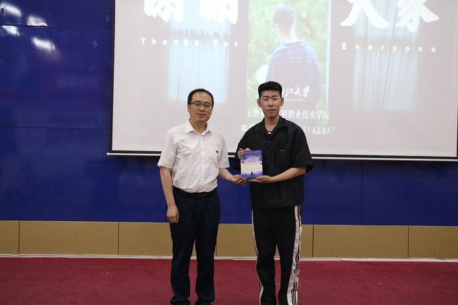 王竹青讲述了自己的学习经历,从军营专科到本科再到浙大研究生一路走来的奋斗历程。星光不负赶路人,时间不负有心人,他用自己的经历告诉我们志不求易者成,事不避难者进,在我们的生活中运气只占很小的一部分,更多的是自身的努力还有恰当的选择,当然,最重要的是坚定不移的决定。无论遭遇任何的挫折和挑战,作为新时代青年的我们都应保持初生牛犊不怕虎、越是艰险越向前的刚健勇毅,无所畏惧、迎难直上。毛风华在活动结束时要求,在校同学们要形成良好的学习习惯,确定个人发展目标并为之努力奋斗,实现个人梦想。随后毛风华为王竹青校友赠书。