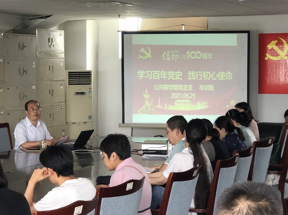 6月29日下午,公共教学部党总支书记牟宗国在天润楼501会议室以“学习百年党史 践行初心使命”为题讲专题党课。公共教学部全体党员教师参加。