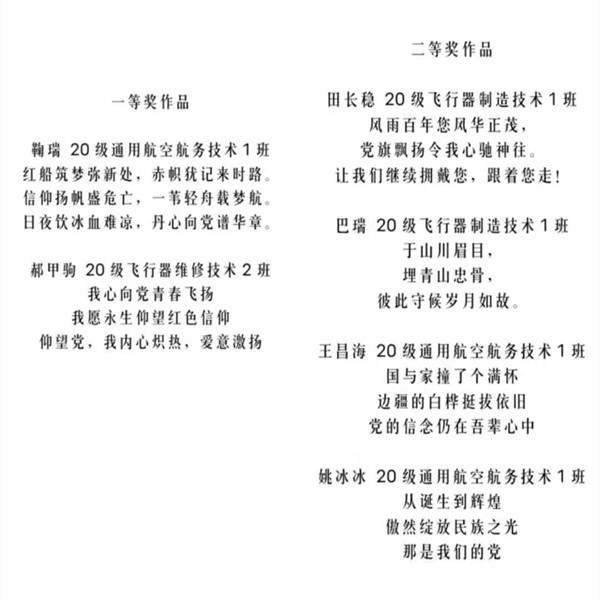 同学们寄情于诗,用微情书的形式来记录党的历史伟业、展现党的百年风华,不仅展现了通用航空学院学子爱党爱国、积极向上的良好品质,更是对党的百年华诞一次美好的献礼!(通用航空学院 苑媛 鞠瑞)