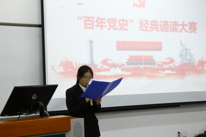 在迎接中国共产党成立100周年之际,为进一步引导师生追寻红色足迹,传承红色基因,汲取奋斗力量,铸牢信仰之基,让红色经典在新时代青年中传诵。6月23日,电子信息工程学院在地滋楼B123举办 “百年党史”经典诵读比赛。
