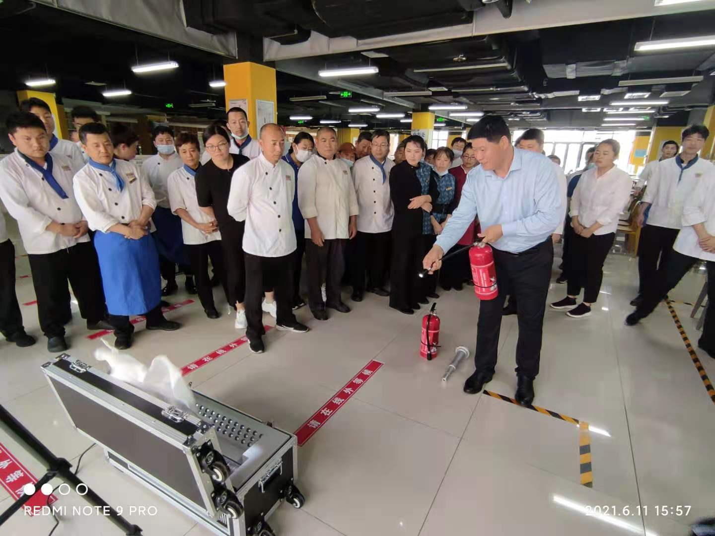 演练模拟二楼餐厅内着火,餐厅值班人员发现火情后,立即进行上报,启动消防应急疏散预案,同时迅速拨打“119”报警。指挥组、灭火组、疏散组、救护组等成员按照分工,有条不紊地切断非消防电源、启动消防泵、疏散楼内职工等流程。随后,保卫处相关人员向大家介绍了火灾的种类,讲解并示范了消火栓和灭火器的使用方法,重点对油锅起火如何使用灭火毯进行了详细培训。现场员工逐一上场进行了实际操作。针对大家在使用中存在的一些问题,保卫处人员还进行了详细指导。