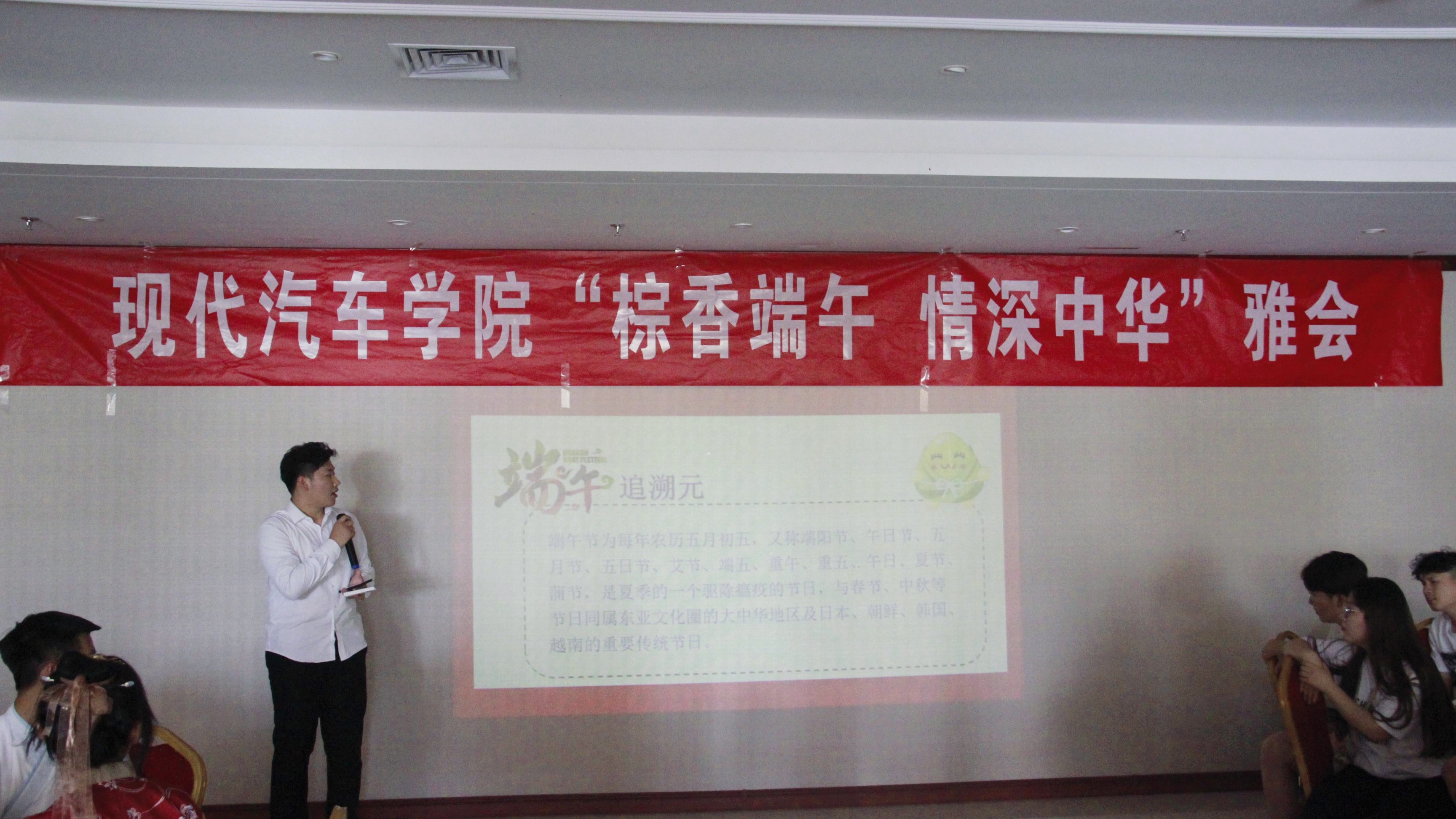 为庆祝端午佳节,凝聚青年力量,6月10日,现代汽学院学子在学校食堂三楼共游“粽香端午,情深中华”雅会。