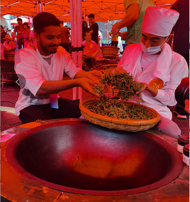 本次博览会包括六大茶类、茶具、紫砂、陶瓷等产品展览,还包括茶艺表演、禅茶艺舞、炒茶大赛、吕剧表演、太极拳比赛等一系列精彩丰富的活动。在活动现场,茶艺师们向留学生悉心传授采茶、制茶的方法,教授了品茶、冲泡方法以及茶具品鉴等茶知识,并展示了娴熟的茶道表演,留学生们不但品尝到不同种类的茶香,还学习到了很多茶知识。参观结束后,留学生们观看了炒茶比赛,当看到经验丰富的炒茶师傅用手炒茶的场面时,留学生们不时发出阵阵赞叹。部分留学生还在炒茶师傅的指导下,自己动手尝试炒茶,表现出对茶文化的浓厚兴趣。