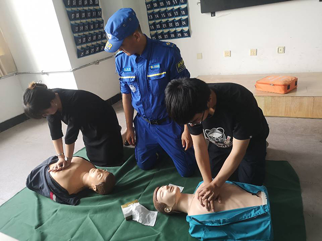 接下来,赵娟讲授了如何正确地进行心肺复苏抢救。当心脏、呼吸骤停时,黄金抢救时间仅为4-6分钟,心搏骤停的严重后果以秒计算,因此黄金抢救时间极为重要。她为同学们讲解了排除气道异物、心肺复苏等基本技能,利用仿真模具进行演示,并邀请同学们在教官的帮助下利用仿真模具模拟心脏复苏操作,大家热情高涨,边听边记边练,表现出了极大的兴趣。