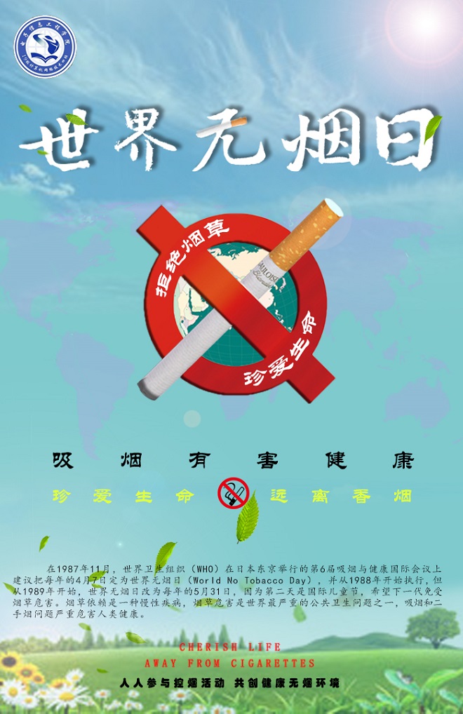 在第34个世界无烟日来临之际,为了营造全民禁烟氛围,创建无烟校园,电子信息工程学院于5月25日-31日开展了“健康环保每一天,无烟地球为明天”为主题的禁烟宣传电子海报设计竞赛活动。