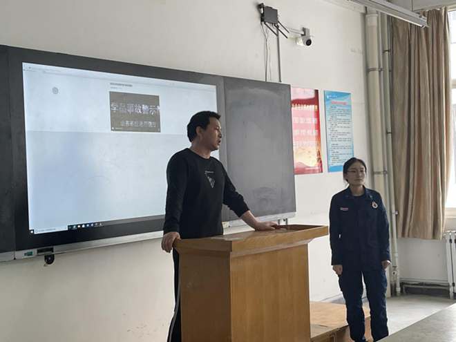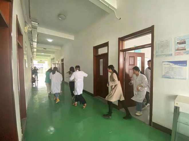 本次应急演练首先邀请日照市消防大队为我院师生全面讲解室内发生火灾时的措施、应急疏散时的秩序、火场中的逃生自救方法、初期火灾的扑灭方法等多方面的灭火知识。随后,开展疏散演练,在听到警报声后,组织疏散人员立即到达指定岗位,指导学生快速疏散,同学们沿着指定的路线快速有序的撤离到停车场上的安全地带,带队教师清点人员,确保每一位学生的安全,整场消防逃生演练过程仅用了两分钟。