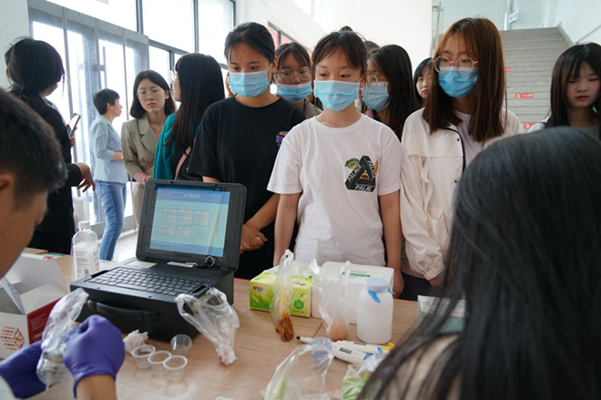 随后,志愿者服务队在市质量检验检测研究院工作人员的带领下,到学校食堂进行食品快检。