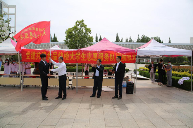 5月26日,海洋工程学院与日照市市场监管局、日照市市场监管检验检测中心联合,在卓越广场举行“党建共建食品快检大学生志愿服务队”授旗仪式。海洋工程学院院长李洪叶、党总支副书记宋庆辉、市质量检验检测研究院党支部书记张燕良出席仪式,全体教师及相关专业学生参加。