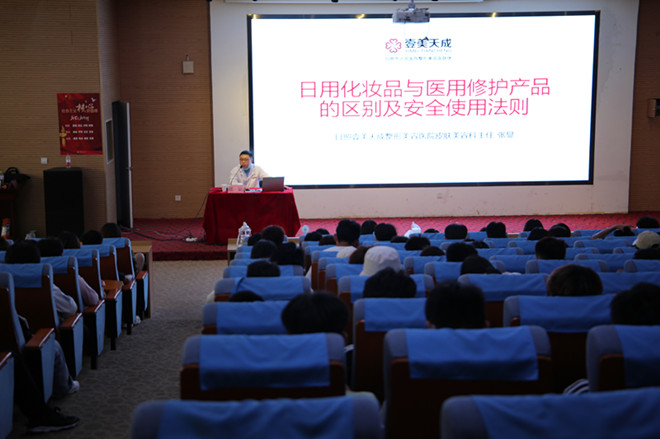 本次论坛邀请到日照市皮肤病医院主治医师赵文鲁和日照壹美天成整形美容医院认证医师张显,分别作了《问题皮肤和医学美容》和《日用化妆品与医用修复产品的区别及安全使用法则》的专题报告。报告针对大学生群体的特点,重点介绍了化妆品安全使用、科学护肤、理性消费等科普知识,并现场解答了观众的问题。