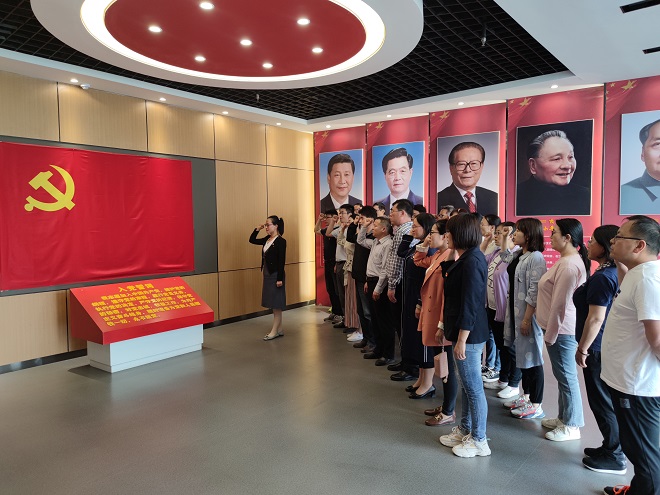 首先,全体党员面对庄严的党旗,集体宣读入党誓词,一起重温入党誓词时的庄严承诺和坚定决心。