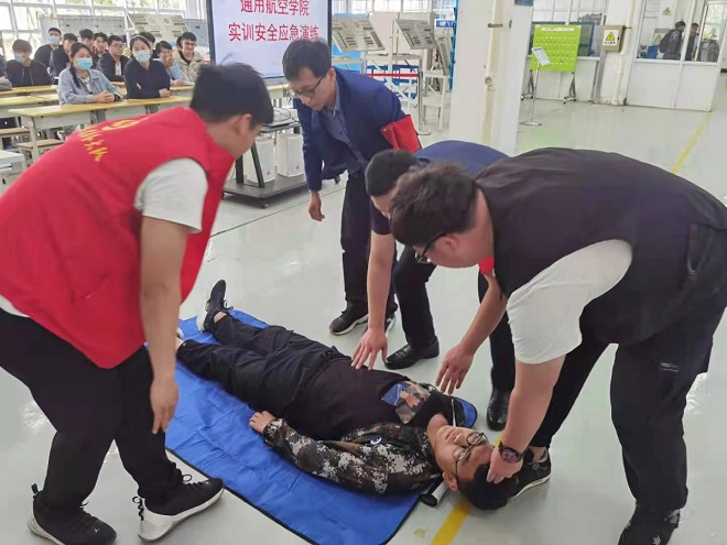 针对此次演练,通用航空学院严格要求,重点部署,认真制定演练预案,针对实训室可能发生的突发事件,设计开展了触电事故应急救援、机械伤害初步处理、初期火灾扑救和人员紧急疏散等内容的应急演练。此次演练,现场参演人员严格按照应急救援预案所制定的计划进行演练,积极主动,进入角色快,整个过程紧张、规范、严谨、有序,现场处置得当、救援及时有效,达到了预期效果。