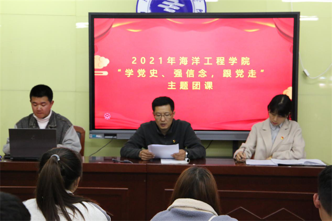 为进一步加强党史学习教育,使全体青年学生做到学史明理、学史增信、学史崇德、学史力行,以昂扬姿态庆祝建党100周年,4月21日晚,海洋工程学院在德润楼338举行了“学党史、强信念、跟党走”党史学习教育主题团课活动。本次活动由党总支副书记宋庆辉主持,辅导员王爱雪主讲。