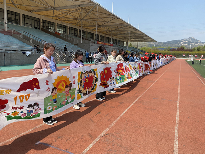百米长卷铺展历史华章,斑斓色彩浸染中国梦想。为庆祝建党100周年,进一步加强大学生爱国主义教育和思想引领,激发学生爱国主义情怀,4月15日,人文与旅游学院近200名师生一起唱响红色歌曲、共绘百米画卷,以独特的形式表达爱党爱祖国的真挚情感。