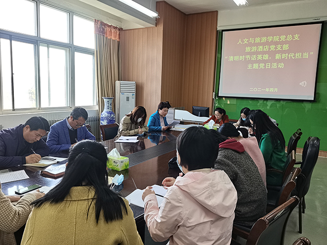 4月8日下午,人文与旅游学院党总支组织开展了四月份第一次主题党日活动。本次主题党日活动以支部为单位、自拟主题开展,活动由各支部书记主持,支部全体党员教师参加。