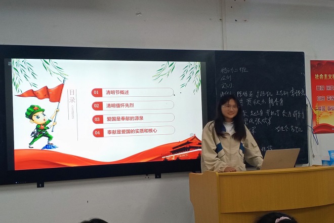 此次班团会各班级向同学们介绍清明节的来历,并讲述先烈们为中华民族解放、独立和国家尊严献出宝贵的生命,为彻底埋葬旧世界,建立社会主义新中国而前赴后继。在战火纷纷的年代,在腥风血雨的艰苦岁月,用浩然正气和崇高理想,谱写了激动人心的不朽篇章,雕塑了雄伟壮丽的丰碑。使同学们感悟到先烈不怕困难、坚持到底的精神,为了革命,抛头颅、洒热血的精神,牺牲自己,造福后人的精神。革命先烈功勋彪炳史册,先烈精神成为激励全国各族人民为实现中华民族伟大复兴而不懈奋斗的力量源泉。