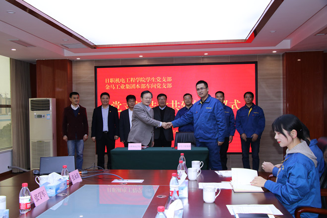 仪式前,与会各方领导及党员代表参观了金马集团展厅、本部机加工车间以及金马新能源有限公司等生产现场。期间,刘君臣介绍了我院学生在金马工作、进步的情况,介绍了企业生产经营和高质量发展情况,以及集团在打造“红色齿轮、党建先锋”党建品牌,不断发挥党员示范岗、党员突击队先锋模范作用过程中,企业各条战线涌现出来的先进事迹、取得的技术创新成果。仪式上,机电工程学院党总支副书记、学生党支部书记成元学和金马工业集团本部车间党支部书记吴业忠代表双方签订了结对共建协议书,并就各自党建工作情况及党建工作经验做法进行了深入交流。仪式结束后,开展了主题党日活动,全体党员重温了入党誓词,本部车间支部党员厉民、李鹏翔两名同志与学生党员代表交流了体会感受。金马建设公司质量安全副经理郑志远、金马新能源有限公司副经理张雪及集团本部电修车间数控维修工程师李鹏翔三名日照职业技术学院校友,分享了自己在日职学习、毕业后到金马集团工作、不断实现自身价值等各个时期的个人成长经历和经验,为与会学生代表志向岗位选择、就业目标规划带来了启迪。