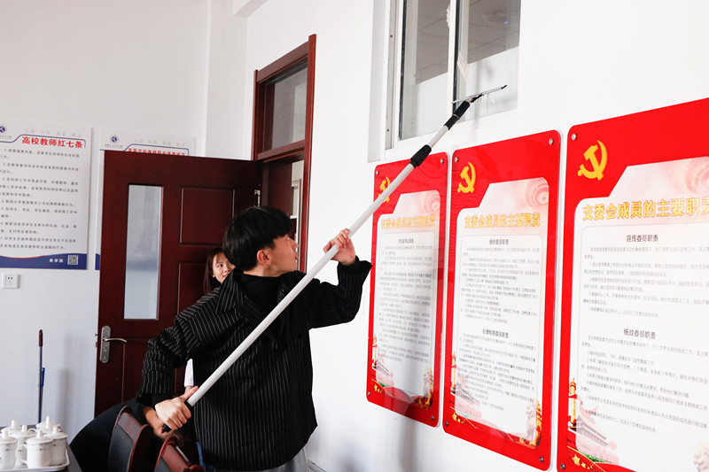 师生们认真清理了公共区域卫生,包括教室内外门窗、黑板讲台以及墙壁桌边“牛皮癣”等死角。活动中,党员学生和学生干部充分发挥示范带头作用,展示了他们“不怕脏、不怕累,敢于冲在前、敢于挑重担”的精神风貌。辅导员们、学生会干部、班长分组与同学们讲解打扫重点、难点,将清理工作中的问题及时反馈,全体学生分工合作,密切配合,对学院卫生死角进行了彻底清理。老师和学生同甘苦、共劳动,充分调动了学生们的工作积极性,让学生们以劳动为荣并乐在其中。经过近两个小时的集体工作,教室环境有了显著提高。