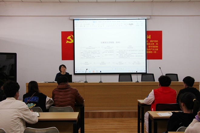 会议开始,费琳琳详细介绍了团支书的工作职责和常规团务工作,使各团支书对常务工作有了更全面的了解和认识,拓宽了工作思路。接着,她就团员发展问题给团支书梳理了发展新团员的政策和发展流程,并对团员档案审核、管理、智慧团建系统使用等问题做出说明。今年恰逢中国共产党成立一百周年,费琳琳倡导各团支部要积极开展学习、庆祝活动,带领支部成员学党史、强信念、坚定不移跟党走。最后,费琳琳对各团支书做出了要求,要加强思想政治学习,在青年大学习和学习强国学习中做表率;要强化责任意识,在学习、生活的方方面面勇于负责,勇于担责;要加强交流,扎实作风,着力提升基层团组织凝聚力和战斗力。