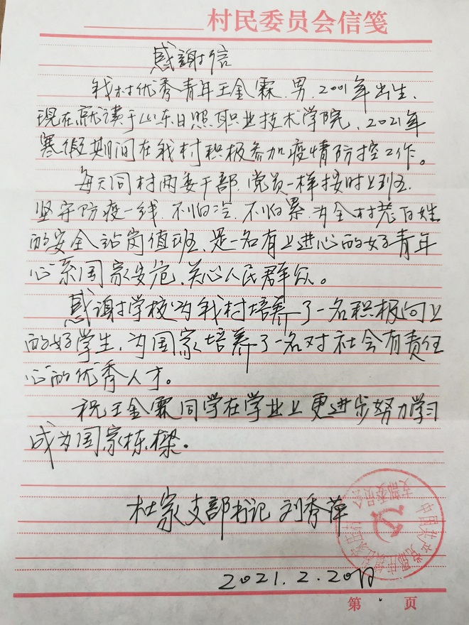 近日,建筑工程学院收到一封来自基础村民委员会的感谢信,建筑工程学院学生王金霖,在寒假期间积极加入当地村委的疫情防控工作,工作态度严谨细心,工作效率认真高效,默默无闻地为守护村民健康贡献了一份力量。