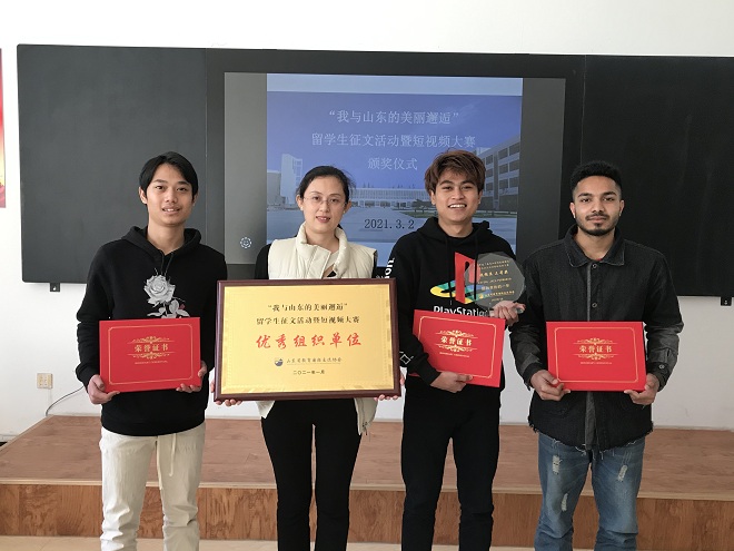 上课结束,丁立孝为在山东省教育国际交流协会举办的“我与山东的美丽邂逅”征文及短视频大赛中获奖的同学颁奖。