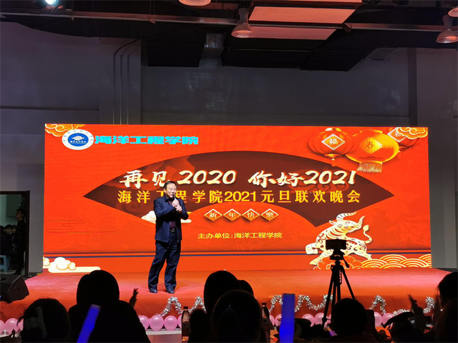 晚会在吉庆祥瑞的龙狮舞中热闹开幕。李宏业向全体师生发表元旦致辞,对过去的一年表示肯定,对未来的一年提出期许和展望。2020年海洋工程学院在教师教学、学生技能大赛、科研创新引领、社会志愿实践、升学就业创业等方面全面开花结果,2021年海洋工程学院将砥砺前行,推动学院发展再创新高。